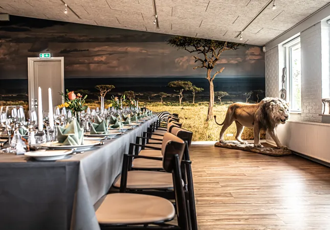 Selskabslokalerne i GIVSKUD ZOO og på GIVSKUD ZOO - HOSTEL er ef en særlig støbning. Her er dyrene synlige på væggene, som udstoppede dyr eller levende dyr i deres bassiner.