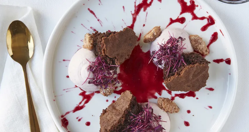 Hjemmebagt brownie med vaniljecreme og marinerede bær