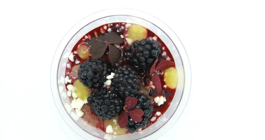 Chokoladebombe med passionsfrugtmousse og mangopure samt guldstøv.