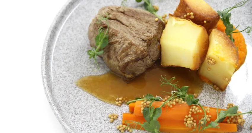 Rødbede Wellington serveret med gulerodsflan, kartoffeltårn, smørpocheret porre og timianreduktion.