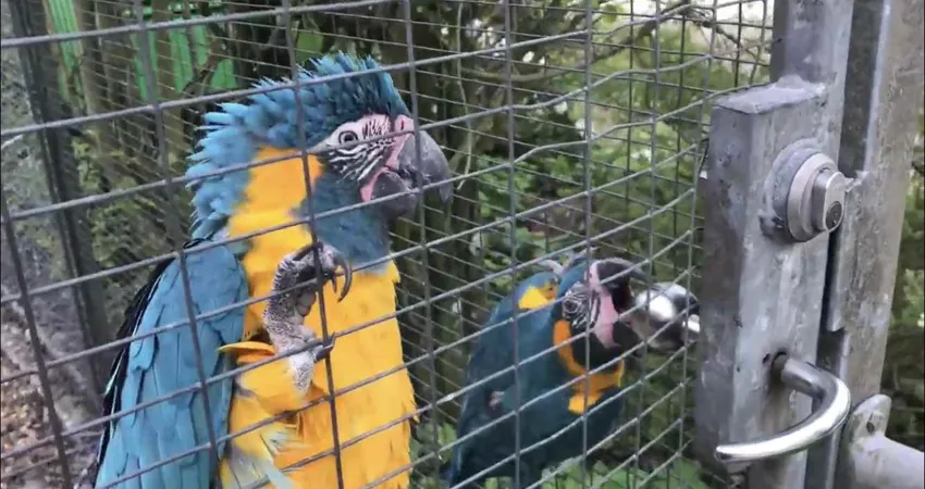 Til at begynde med sad de to blåstrubede araer ganske tæt ved lågen ind til deres voliere, når dyrepasser Francois Lemonnier kom med mad. Og de søgte også mod indgangslågen og låsen.
