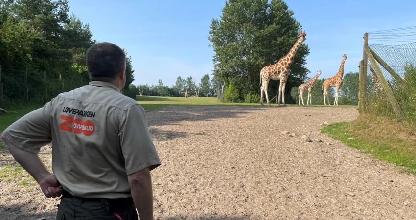 Dyrepasser Francois Lemonnier er ved at lægge sidste hånd på formiddagens rutine denne sommerdag; at lukke dyrene i GIVSKUD ZOO – ZOOTOPIA ud fra deres stalde til de store anlæg. Turen er nu kommet til girafferne.