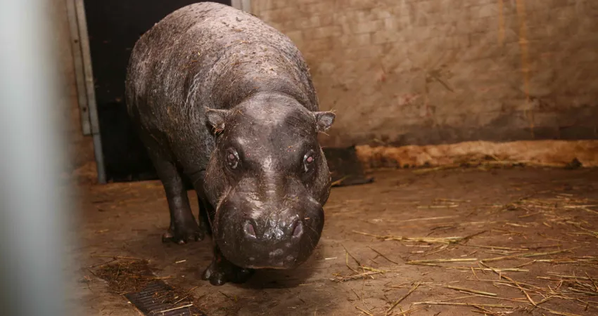 GIVSKUD ZOO – ZOOTOPIAs dværgflodhest Micro Chip kommer gerne ind, når dyrepasser Tina Frisk kommer til stalden om morgenen. For hun har nemlig vænnet ham til, at der er snacks, når han kommer ind i stalden.