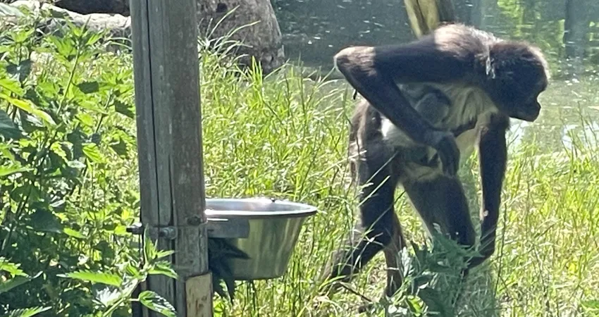 Det er muligt at opleve den nyfødte unge allerede nu ved de brune edderkopabers anlæg ved området P1 i GIVSKUD ZOO – ZOOTOPIA.