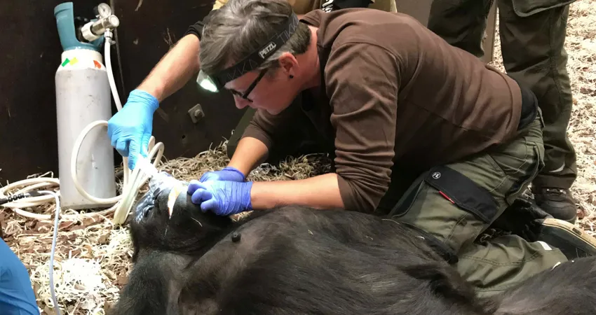 Sammen med to dyrepassere og to biologer løfter dyrlægen gorillaen ind til tjek i stalden. En sørger for ilt, en tager billeder, en monitorer vejrtrækning, og en hjælper dyrlægen.