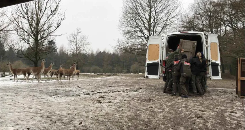 Allerede tidligt onsdag morgen samledes GIVSKUD ZOOs dyrlæge, en biolog og en flok dyrepassere for at hjælpes af med dagens transport. En ung guanaco-han, som er knap et år gammel, skal flytte til Prag Zoo.