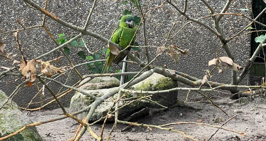 En lille blåpandet dværgara kravler og hopper lige for tiden rundt i bunden af fuglenes voliere ved området P1 i GIVSKUD ZOO – ZOOTOPIA. Det har fået flere gæster til at spørge, om der er noget galt med fuglen.