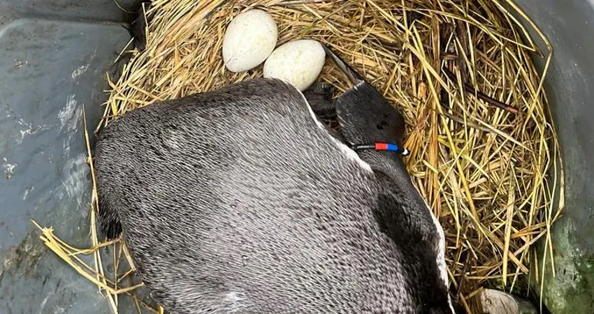 Det er første gang, at parkens pingviner ruger i redekasserne, så dyrepasseren er glad;