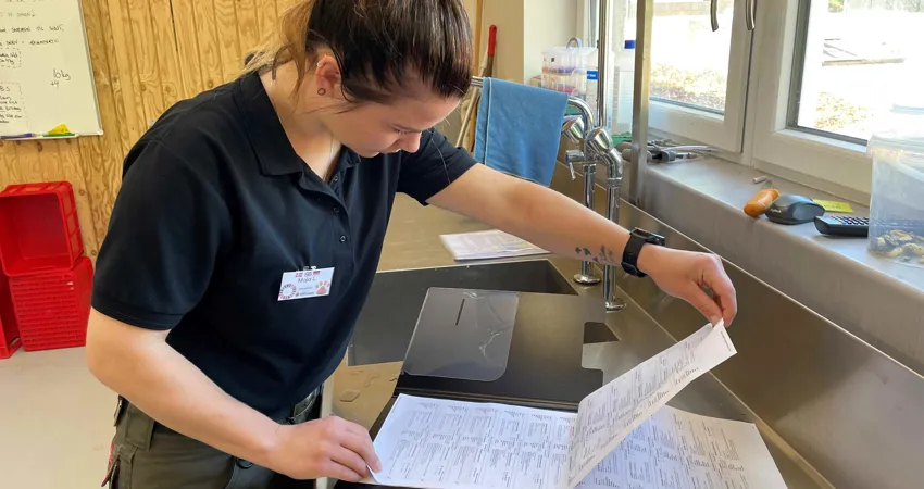 Dyrepasser Maja Lassen tjekker listen over humboldtpingviner i GIVSKUD ZOO – ZOOTOPIA. Hun vil lige undersøge, hvor gammel parkens yngste pingvin er.