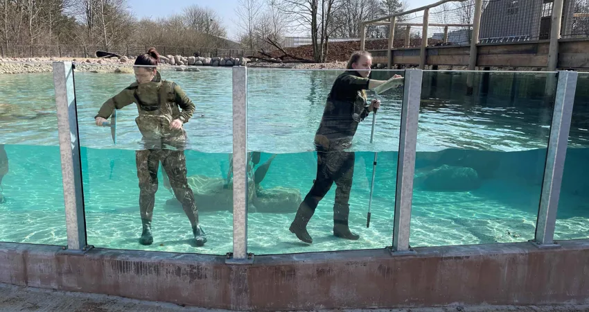 Iført waders og side om side går dyrepasserne Maja Lassen og Trine Axelsen rundt og pudser ruderne i humboldtpingvinernes store anlæg i GIVSKUD ZOO - ZOOTOPIA. Trine Axelsen går forrest og pudser med en klud, mens Maja Lassen følger efter og skraber ruderne rene.