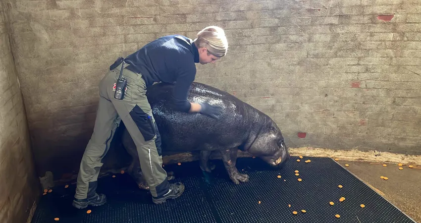 Behandlingen med babyolie foregår altid på Micro Chips præmisser, og dyrepasseren holder løbende øje med, om dværgflodhesten er tilfreds og rolig.