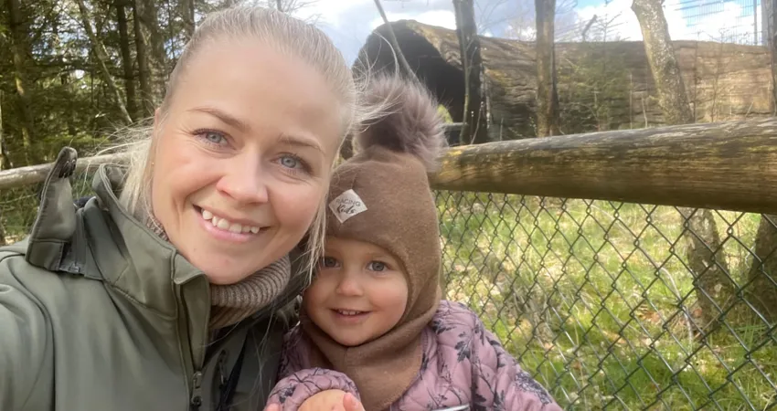 Mira på to år er et stort smil, da hun ankommer til GIVSKUD ZOO – ZOOTOPIA med sin mor, Charlotte Stobberup Holmberg.