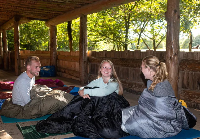 Hos ulvene sover I på gulvet på verandaen eller i en bjælkehytte på jeres underlag og i egen sovepose. Det er den mest primitive overnatningsform i GIVSKUD ZOO. I tilbereder mad over bål, på grill eller spiser i et af spisestederne i parken.