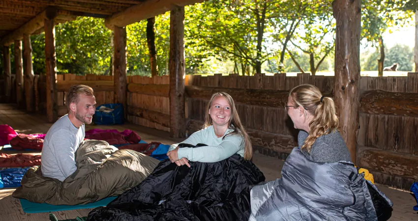 Når I overnatter hos ulvene sover I på gulvet på verandaen eller i en bjælkehytterne, i jeres egen sovepose. Ligger I på verandan kan I se ulvene i øjnene, hvis I vil. Hen på eftermiddagen, når der falder ro over parken, får to timers fortælling om ulvene af en af vores guider, hvis de har plads i programmet. Hvis dagen tillader det kommer I med i kølerummet, hvor I informeres om, hvad ulvene spiser. Zooguiden er også behjælpelig med at få tændt bål i tipilejren lige ved siden af ulveanlægget.
